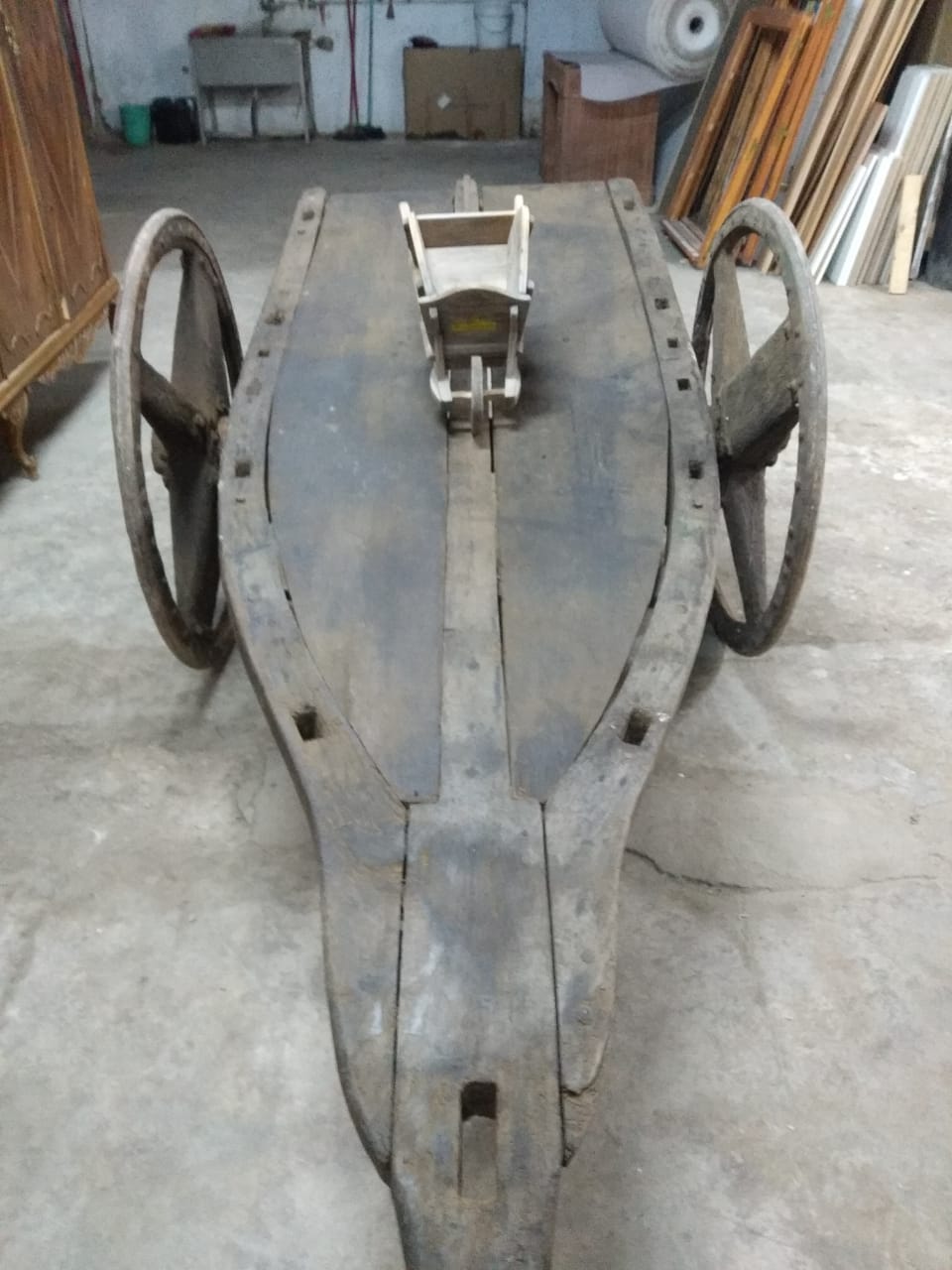 Antigua carreta de madera artesanal, pieza original de uso rural tradicional. Fabricada en madera maciza con grandes ruedas de aro metálico, esta carreta era utilizada para el transporte de mercancías y cosechas, generalmente tirada por animales de tiro. Su estructura robusta y diseño funcional reflejan la ingeniería rústica de la época, combinando resistencia y sencillez.