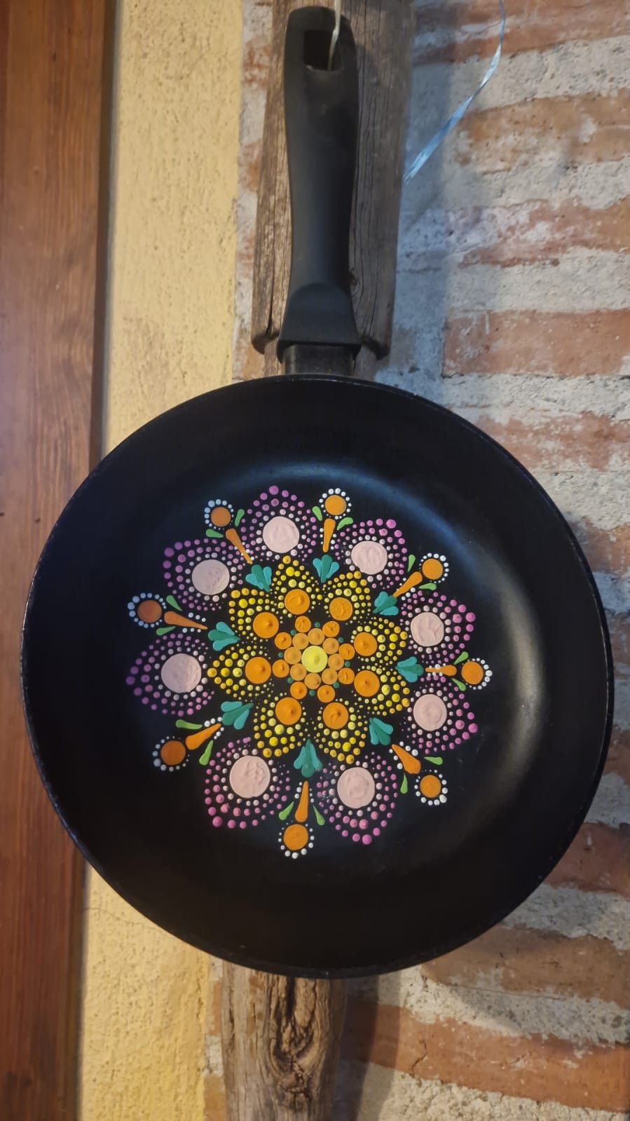 Sartén decorativa única de la serie Mandalas, cuidadosamente pintada a mano. Una pieza artística que transforma un objeto cotidiano en un elemento de diseño original y lleno de color.